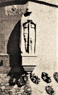 Ehemaliges Denkmal für die Gefallenen des Ersten Weltkriegs, befestigt an eine Ecke der Kirchen-Außenwand. Auf einem Vorsprung mit der Widmung stand ein trauernder Soldat mit Stahlhelm und Umhang, der sich auf sein Gewehr stützt. Oberhalb an der Kirchenwand waren beidseitig EK-Zeichen mit Lorbeer, sowie die Zahlen 1914 und 1918 angebracht. Nach 1945 wurde zuerst der Soldat gestürzt und später restlos alle Teile des Denkmals entfernt, so dass die Kirchenwand wieder „unbefleckt“ aussieht.