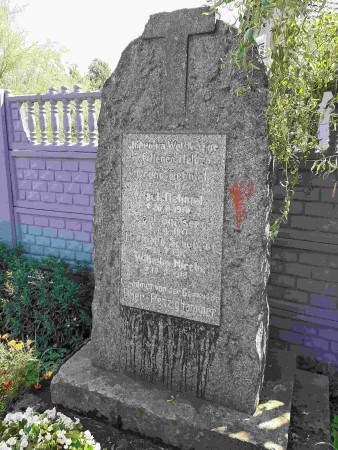 Denkmal für die Gefallenen des Ersten Weltkriegs: Aufgerichtete Granitplatte mit Kreuz im oberen Bereich.