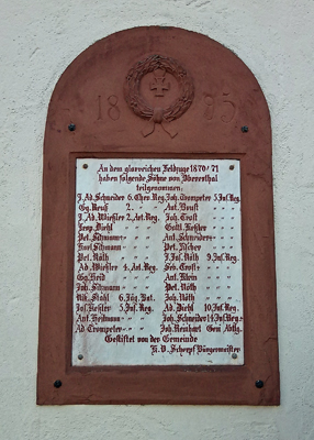Namenstafel der Teilnehmer am Krieg 1870-71 mit Sandsteinumrahmung links vom Haupteingang der Kirche St. Antonius Eremit in Obererthal.