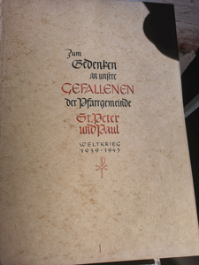 In der Kirche liegt vor einer Figurengruppe ein Namensbuch mit Gefallenen der Pfarrkirche St. Peter und Paul des Zweiten Weltkrieges aus.