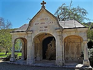 In den Seitenteilen befinden sich Gedenktafeln aus Stein.