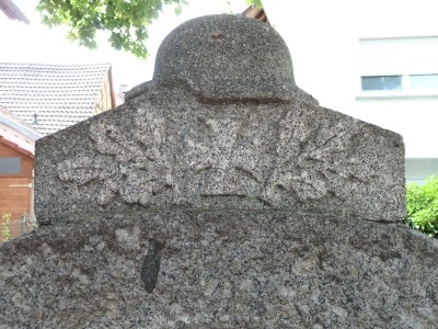 darunter befindet sich ein Eisernes Kreuz, das links und rechts von je einem Eichenzweig eingerahmt wird. Auf der Rückseite des Denkmals ist das ebenfalls in den Stein eingefügte Ortswappen zu sehen.