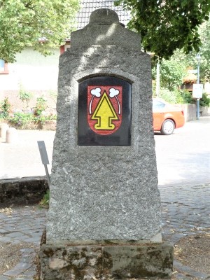 Kleine Denkmalanlage in der Ortsmitte. Der Gedenkstein mit eingesetzter dunkler Marmortafel wird nach oben abgeschlossen von einem steinernen Stahlhelm,