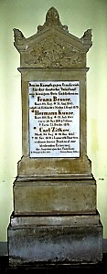 Der Abschluss dachförmig mit schmückenden Elementen und darunter Lorbeer und