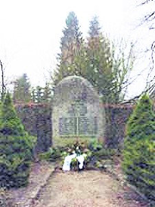Ein Findling an der Hauptstraße mit eingemeißeltem Eisernem Kreuz und den Namen der Opfer.