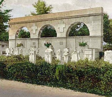 Denkmal für die Gefallenen des Ersten Weltkriegs aus Oschatz, Zschöllau und des Ulanen-Regiments Nr. 17 auf dem städtischen Friedhof: Breite Wand aus Steinblöcken mit drei halbrunden Durchbrüchen im oberen Bereich und drei Inschriftentafeln in den abgesetzten Feldern darunter. Vor dem Denkmal lagen die Kriegsgräber des Ersten Weltkriegs. Das Denkmal ist in einem schlechten Zustand.