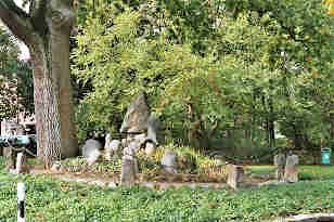 In der Ortsmitte von Papendorf in einer Anlage unter einer großen Eiche eine Ansammlung von Findlingen, auf dem größten Findling eine Metalltafel mit Stahlhelm,