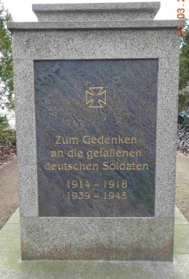 Gedenkstein für die Kriegsopfer der Stadt im Ersten und Zweiten Weltkrieg vor dem Kürassier-Denkmal am alten Friedhof: Quader mit drei eingelassenen Widmungstafeln.