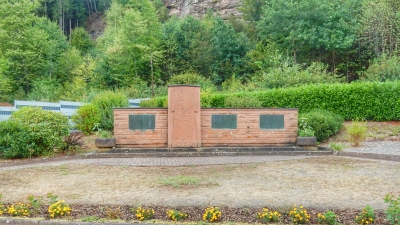 Auf einer Sandsteinmauer mit drei eingelassenen Metalltafeln die Namen der Gefallenen.