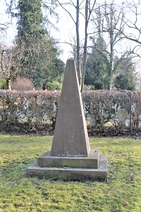 Im Hauptfriedhof, in einem der Kriegsgräberfelder des Zweiten Weltkrieges: Steinpyramide mit Inschriften an zwei Seiten.