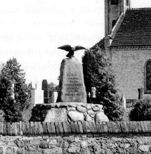 Denkmal für die Gefallenen des Ersten Weltkriegs: Großer Feldsteinsockel mit aufgerichtetem Findling und krönendem Adler (abgerissen).