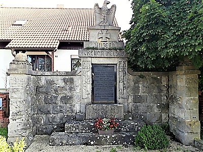 Abgeschlossen wird das Denkmal nach oben mit zwei Querbalken mit Aufschrift und in der Front des Daches ein Eisernes Kreuz.