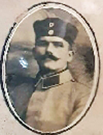 der Gefallenen und deren Fotos. Rund um das Eiserne Kreuz stehen die Namen der sonstigen Kriegsteilnehmer.