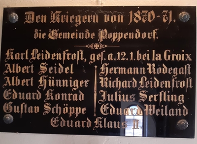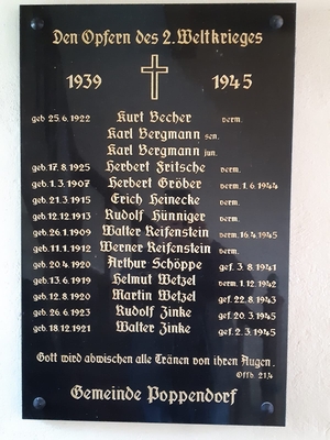 Im Vorraum zum Kirchenschiff hängen zwei schwarze Tafeln. In vergoldeten Buchstaben verzeichnen sie die Poppendorfer Männer,