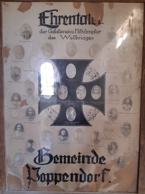 die 1870-71 und im Zweiten Weltkrieg ihr Leben ließen. Die Ehrentafel "Erster Weltkrieg" aus Pappe ist stark beschädigt.