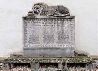 Steinblock mit Namen und Inschriften, auf dem Block ein liegender Löwe.