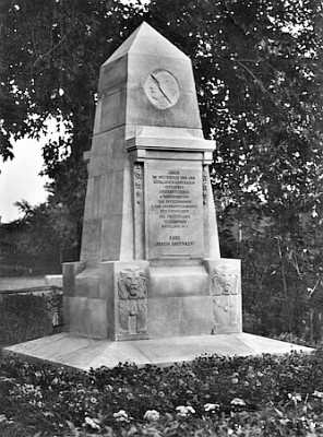 Ehemaliges Denkmal für die Gefallenen des Telegraphen-Bataillons Nr. 1 in der Kaserne der 3. (preußischen) Nachrichten-Abteilung im Ersten Weltkrieg (an der Nedlitzer Straße): Abgestufter Obelisk mit Soldatenkopf mit Stahlhelm im oberen Bereich und Löwen-Reliefs unten.