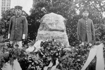 Ehemaliges Denkmal für die Gefallenen des Militärwaisenhauses im Ersten Weltkrieg: Aufgerichteter Findling mit Inschriften. Das Denkmal verschwand nach 1945.