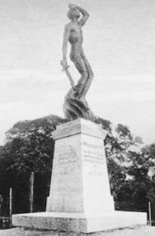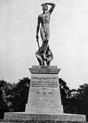 Ehemaliges Denkmal für die Gefallenen des Infanterie-Regiments Generalfeldmarschall Prinz Friedrich Karl von Preußen (8. Brandenburg.) Nr. 64: Abgestufte Stele mit Widmung und krönender Figur eines nackten trauernden Kriegers mit Schwert in der Hand, der aus einer Flamme aufsteigt. Das Denkmal wurde nach 1945 abgerissen.