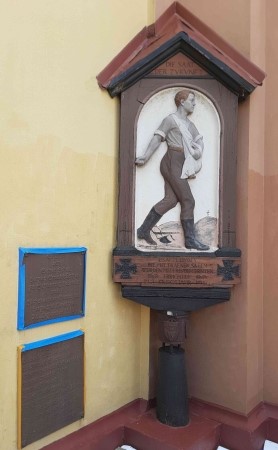 Gedenken des Kriegsjahres 1916 an der evangelischen Kirche: Geschnitzte überdachte Tafel eines säenden Soldaten mit EK-Zeichen und zwei Metall-Tafeln.