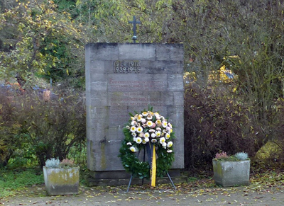 Ein christliches Kreuz steht auf dem schlichten Steinblock, auf dem der Opfer der beiden Weltkriege gedacht wird.