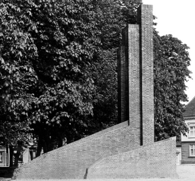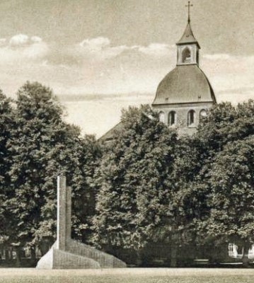 Ehemaliges Denkmal für die Gefallenen des Ersten Weltkriegs vor der Kirche: Aus Klinkern gemauerter Vorderteil eines Schiffes mit weit nach oben ragendem Steven. Inschriften und 12 in der Länge zur Mitte aufsteigende Namenstafeln befanden sich im Inneren des „Schiffes“. Das Denkmal wurde 1938 als entartet auf Anweisung der NS-Machthaber abgerissen.