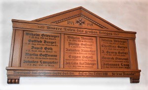 Holztafel in der Kirche mit den Namen der Gefallenen des Ersten Weltkriegs.