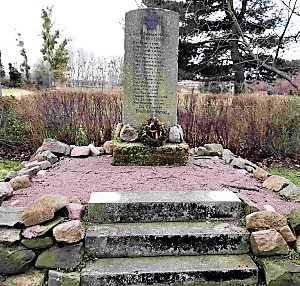 Denkmal für die Gefallenen des 1. Weltkriegs an der Hauptstraße: Plateau umrandet von Feldsteinen mit aufgerichteter Steinplatte.