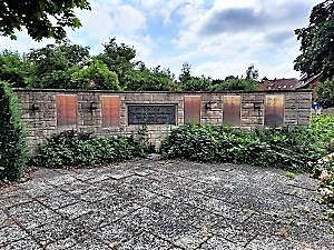Dazu mehrere in eine Sandsteinmauer eingelassene Metalltafeln mit einer Inschrift und den Namen aller Rössinger Toten des Zweiten Weltkriegs.