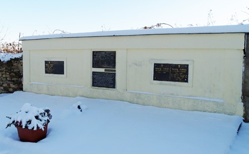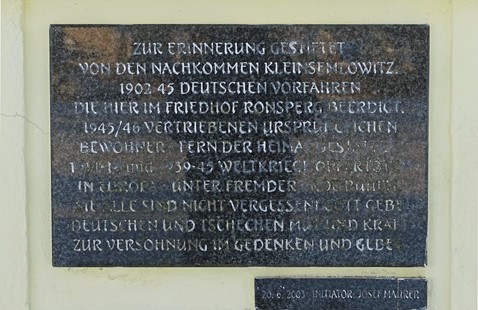 Zwei gravierte Steinplatten (deutsch & tschechisch) an der Friedhofsmauer angebracht. Und ein Einzelgedenken auf einem noch vorhandenen Grabstein.