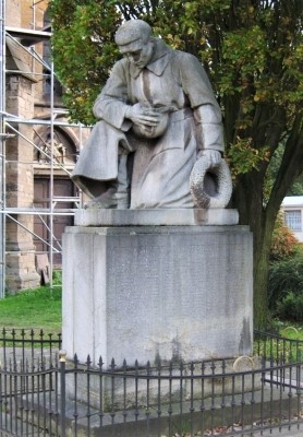 Denkmal für die Gefallenen des Ersten Weltkriegs vor der Kirche: Quader mit Inschriften, darauf die kniende Figur eines trauenden Soldaten mit Stahlhelm und Ehrenkranz in den Händen.