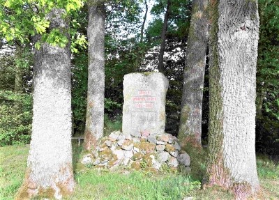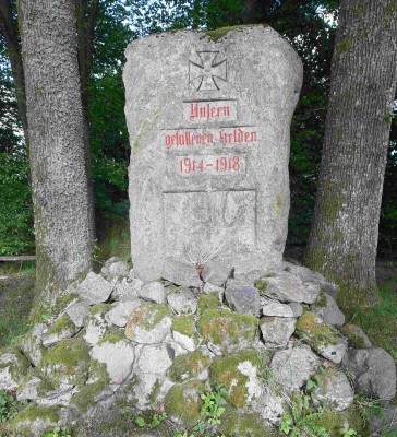 Im Dorfzentrum steht das Denkmal für die Gefallenen des Ersten Weltkriegs: Umrandet von vier mächtigen Bäumen steht ein Findling auf einem Feldsteinhaufen.