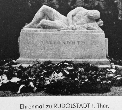 Ehemaliges Denkmal für die Gefallenen des Ersten Weltkriegs der Stadt Rudolstadt: Quader mit kurzer Widmung und aufliegender Figur eines nackten liegenden sterbenden Kriegers mit einer Standarte in den Händen. Das Denkmal verschwand nach 1945.