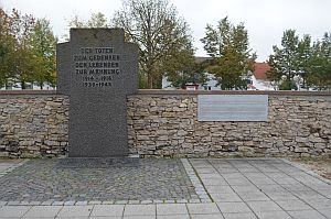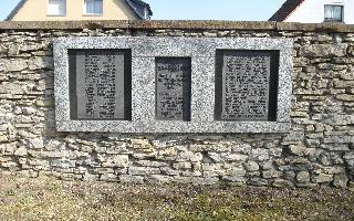 Vor einer Mauer innerhalb des Friedhofes steht eine Steinplatte in Form eines Kreuzes, darauf eine Inschrift.