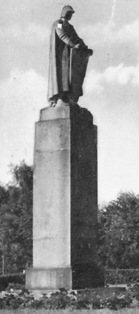 Denkmal für die Gefallenen des Ersten Weltkriegs: Viereckige Stele mit krönender großer Figur eines Ordensritters mit Mantel, Helm und Schild (umgewidmet).
