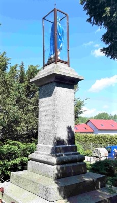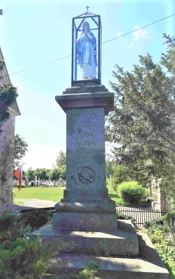 Denkmal für die Gefallenen des Ersten Weltkriegs vor der Kirche: Abgestufte Stele mit Stahlhelm-Relief. Nach 1945 wurde ein Schaukasten mit Marienfigur aufgesetzt.