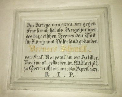 Gedenktafel für einen Gefallenen des Feldzugs 1870/71 in der katholischen Pfarrkirche Heilige Dreifaltigkeit.