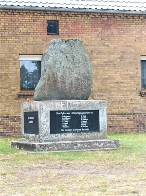 Auf einen quaderförmigen Betonsockel wurde ein Findlingsblock aufgerichtet. Dieser trägt keine Inschrift. Die Inschriften sind an den Seiten des Sockels angebracht.