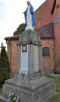 Nach 1945 wurde in Ostbrandenburg die deutsche Bevölkerung vertrieben und die meisten Denkmäler abgerissen, beschädigt oder umgewidmet. Hier sind fast alle Inschriften verschwunden. Sie sind wohl mit Mörtel zugeschmiert. Eine Notiz im Internet vermerkt, dass das Denkmal 2009 neu übertüncht wurde, da Teile abbröckelten und die alten Inschriften sichtbar wurden. Wahrscheinlich wurde das Denkmal ursprünglich von einem Adler oder EK-Zeichen gekrönt. Alte Aufnahmen oder Aufzeichnungen der Namen waren nicht auffindbar und werden gesucht.