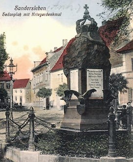 Ehemaliges Denkmal für die Gefallenen des Krieges 1870/71 am Sedanplatz: Abgestufte Stele mit eingelassenen Widmungs- und Namenstafeln mit einer großen Kaiserkrone an der Spitze. Der obere Teil des Denkmals war ein rauer Felsblock. Unter den Tafeln befanden sich an allen vier Ecken Adlerfiguren. Das Denkmal wurde nach 1945 abgerissen.