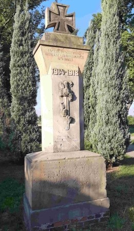 Denkmal für die Gefallenen des Ersten Weltkriegs auf dem Kirchhof: Abgestufte Stele mit krönendem EK-Zeichen und Schwert-Relief.