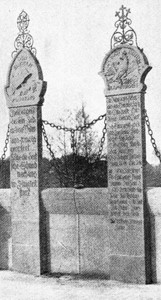 Denkmal für die Gefallenen des Ersten Weltkriegs auf der Brücke über den Glumia Fluss, eingearbeitet in die Brückenmauer: Zwei flache Stelen mit reich verzierten Oberteilen, die mit Ketten verbunden waren, in deren Mitte ein EK-Zeichen befestigt war. Eine Stele zeigte oben das Relief eines Stahlhelms und trug die Widmung, die andere einen Adler und die Auflistung der Namen (abgerissen).