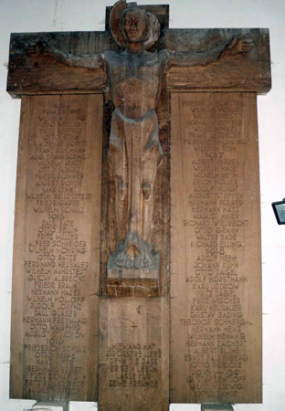 Die große Gedenktafel mit zentraler Christusfigur für die Gefallenen des 1. Weltkrieges in der Kirche ist eine Holzschnitzarbeit