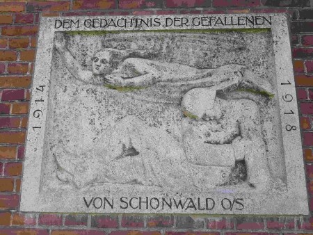 Gedenken für die Gefallenen des Ersten Weltkriegs: Relief eines sterbenden Soldaten mit einem fliegenden Engel an der Kirchen-Außenwand.