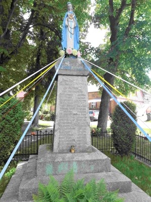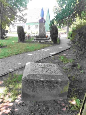 Denkmal für die Gefallenen des Ersten Weltkriegs: Abgestufte Stele mit EK-Zeichen in der Mitte. Nach 1945 wurden alle Inschriften sauber herausgemeißelt und eine Marienfigur aufgesetzt. Nur das EK und die Zahlen 1914 und 1918 blieben erhalten. 20 Meter entfernt liegt noch ein Quader mit Stahlhelm-Relief, der vielleicht noch unten oder oben im Denkmal eingefügt war.