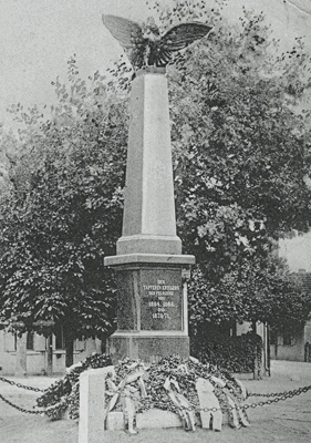 Denkmal für die Gefallenen der Kriege 1864-1871: abgestufter Obelisk mit krönendem Adler (nach 1945 abgerissen).