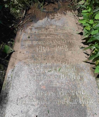 Nach 1945 wurde in Hinterpommern die deutsche Bevölkerung vertrieben und die meisten Denkmäler abgerissen, beschädigt oder umgewidmet. Hier ist ein besonders schlimmes Beispiel für den Umgang mit den Denkmälern der deutschen Gefallenen. Es wurde zerschlagen und die Teile wie Abfall hinter der Kirche abgekippt. Der große Stein ist zum Glück nicht ganz im Sumpf versunken und man kann die Inschriften noch lesen. Wo die Namen der Gefallenen notiert waren ist unbekannt. Vielleicht stehen sie auf der Rückseite dieses Steins.
