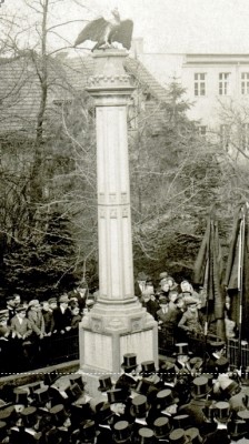 Ehemaliges Denkmal für die Gefallenen des Krieges 1870/71 an der Bahnhofstraße: Kleiner abgestufter Quader mit Inschriften und aufgesetzter klassischer Säule mit krönendem Adler. Das Denkmal wurde nach 1945 komplett abgerissen.