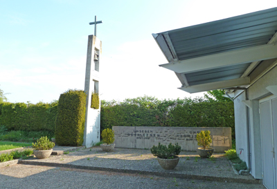 Moderne aus Beton gefertigte Gedenkanlage mit Glockenturm auf dem Friedhof, unmittelbar neben der Aussegnungshalle.