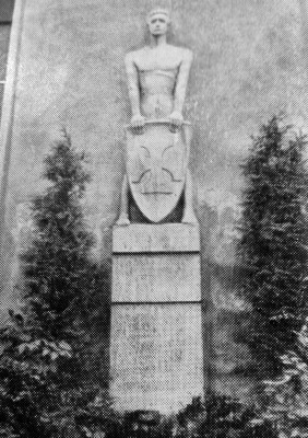 Das Wanddenkmal wurde ursprünglich von der Figur eines nackten Kriegers, der sich auf sein Schild mit EK-Zeichen stützt, gekrönt. Diese wurde nach 1945 abgeschlagen.